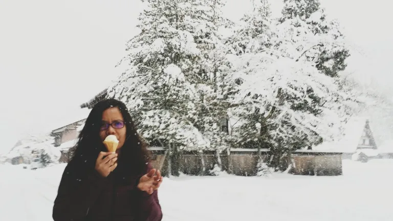 We only had breakfast in the morning, so we had some Hida Beef Stick for a snack, coffee, and of course, ice cream! Yes, I went outside the store without my gloves just to have a picture of me eating vanilla ice cream under the snow taken. No judging, please.