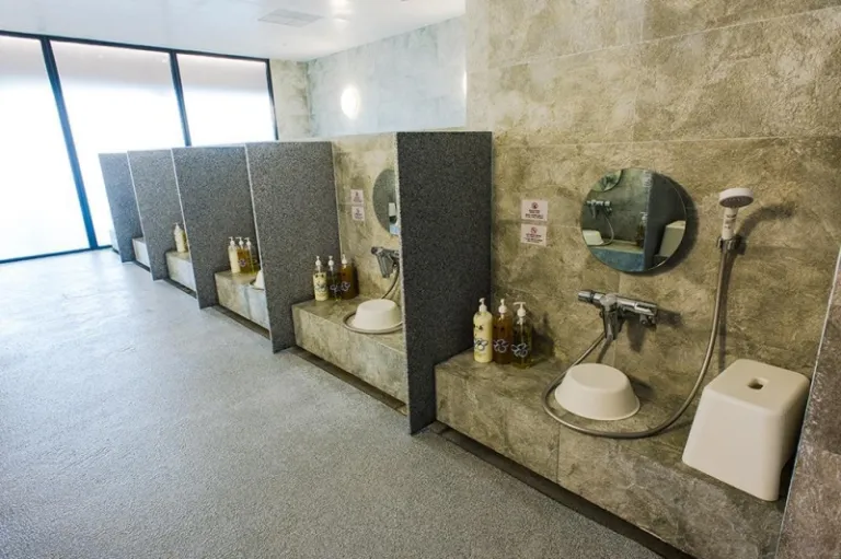 It’s tempting to strip and jump into the pools once you set eyes on them, but guests should wash themselves clean before soaking away. Beside the pools is the shower area with stools and bottles of toiletries.